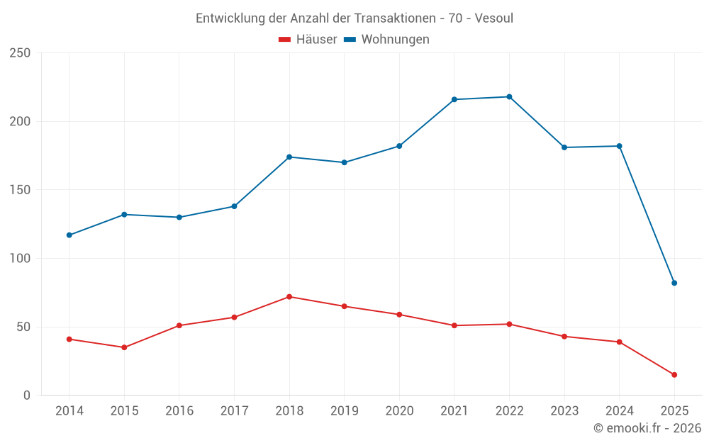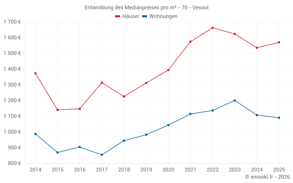 Der Durchschnittspreis auf den 41 Hausgeschäften der letzten 12 Monate in der Gemeinde Vesoul betrug 1 539 € pro Quadratmeter für einen mittleren Immobilienwert von 139 475 €. Über diesen Zeitraum hinweg lagen 60% der Transaktionen zwischen 1 130 und 1 823 € pro Quadratmeter (vom 2. bis zum 8. Dezil).