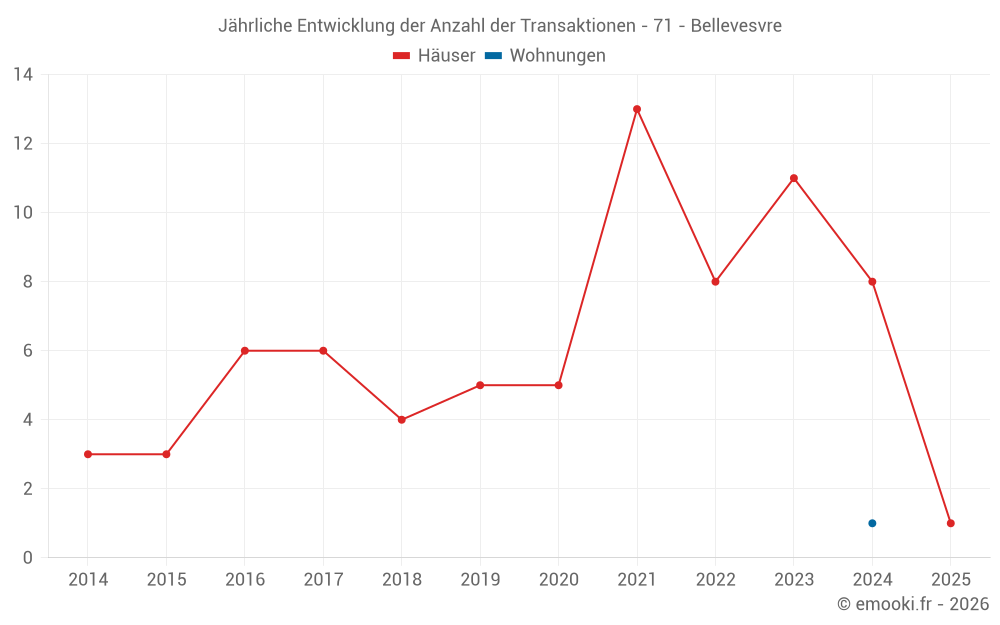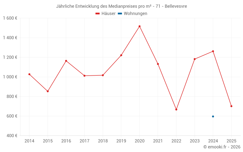 Der Durchschnittspreis auf den 15 Hausgeschäften der letzten 24 Monate in der Gemeinde Bellevesvre betrug 1 208 € pro Quadratmeter für einen mittleren Immobilienwert von 121 000 €. Über diesen Zeitraum hinweg lagen 60% der Transaktionen zwischen 696 und 1 719 € pro Quadratmeter (vom 2. bis zum 8. Dezil).