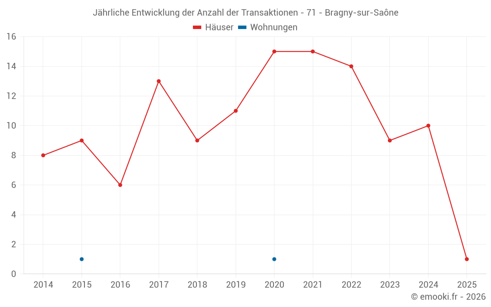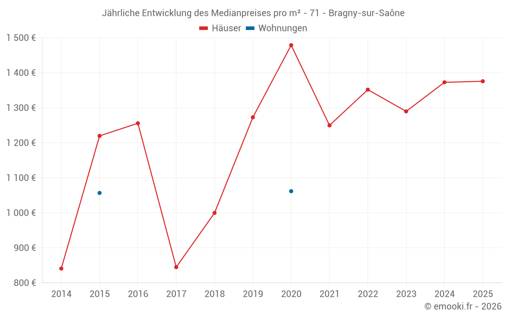 Der Durchschnittspreis auf den 15 Hausgeschäften der letzten 24 Monate in der Gemeinde Bragny-sur-Saône betrug 1 376 € pro Quadratmeter für einen mittleren Immobilienwert von 99 000 €. Über diesen Zeitraum hinweg lagen 60% der Transaktionen zwischen 714 und 1 877 € pro Quadratmeter (vom 2. bis zum 8. Dezil).