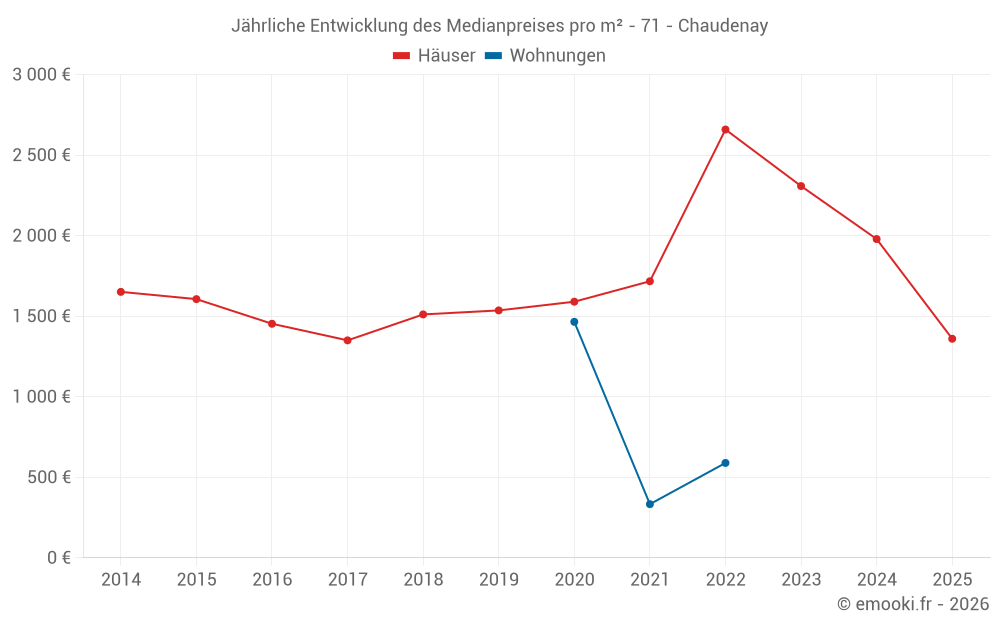 Der Durchschnittspreis auf den 18 Hausgeschäften der letzten 24 Monate in der Gemeinde Chaudenay betrug 1 742 € pro Quadratmeter für einen mittleren Immobilienwert von 168 000 €. Über diesen Zeitraum hinweg lagen 60% der Transaktionen zwischen 865 und 2 437 € pro Quadratmeter (vom 2. bis zum 8. Dezil).