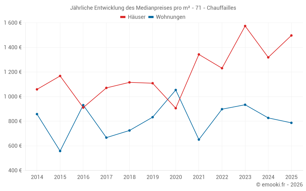 Der Durchschnittspreis auf den 30 Wohnungstransaktionen der letzten 24 Monate in der Gemeinde Chauffailles betrug 849 € pro Quadratmeter für einen mittleren Immobilienwert von 48 900 €. Über diesen Zeitraum hinweg lagen 60% der Transaktionen zwischen 210 und 1 090 € pro Quadratmeter (vom 2. bis zum 8. Dezil).