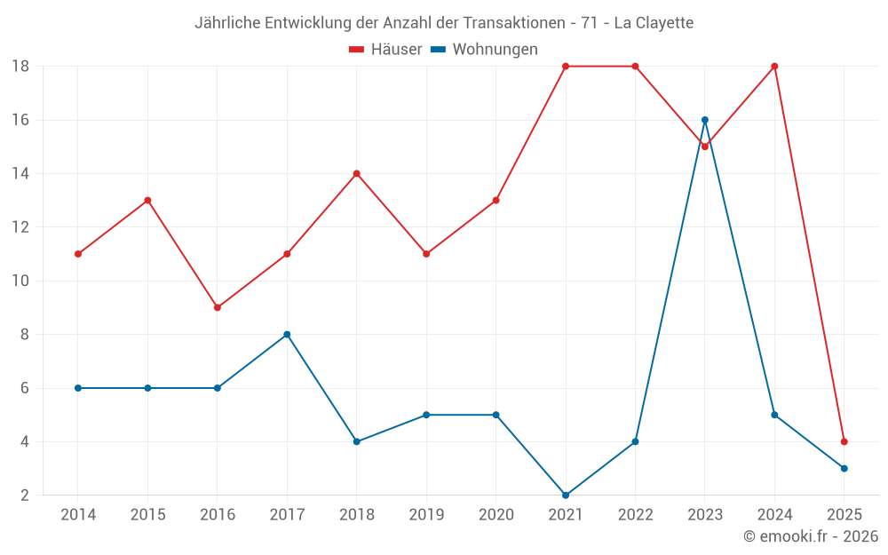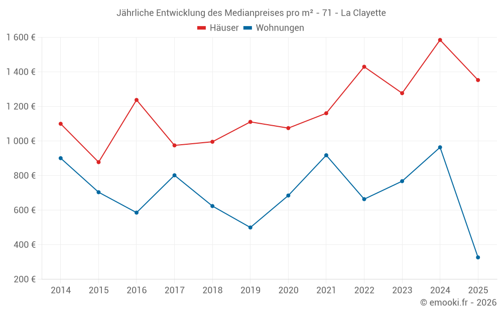 Der Durchschnittspreis auf den 15 Wohnungstransaktionen der letzten 24 Monate in der Gemeinde La Clayette betrug 642 € pro Quadratmeter für einen mittleren Immobilienwert von 55 000 €. Über diesen Zeitraum hinweg lagen 60% der Transaktionen zwischen 231 und 1 056 € pro Quadratmeter (vom 2. bis zum 8. Dezil).