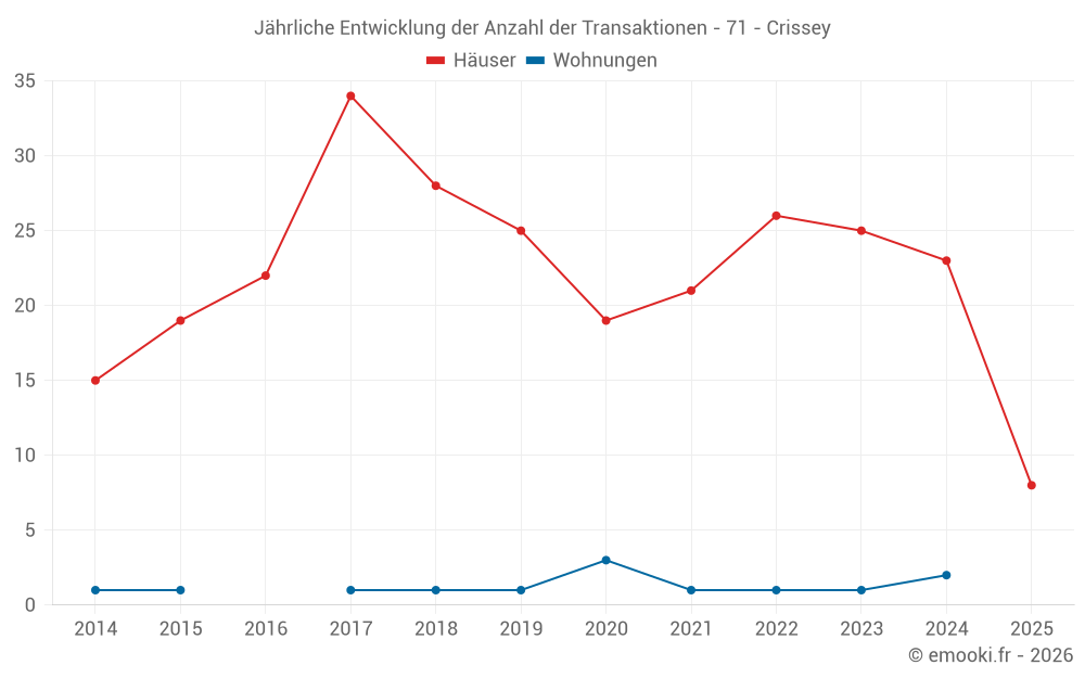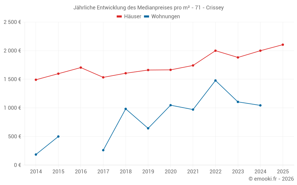 Der Durchschnittspreis auf den 20 Hausgeschäften der letzten 12 Monate in der Gemeinde Crissey betrug 2 180 € pro Quadratmeter für einen mittleren Immobilienwert von 244 485 €. Über diesen Zeitraum hinweg lagen 60% der Transaktionen zwischen 1 757 und 2 533 € pro Quadratmeter (vom 2. bis zum 8. Dezil).