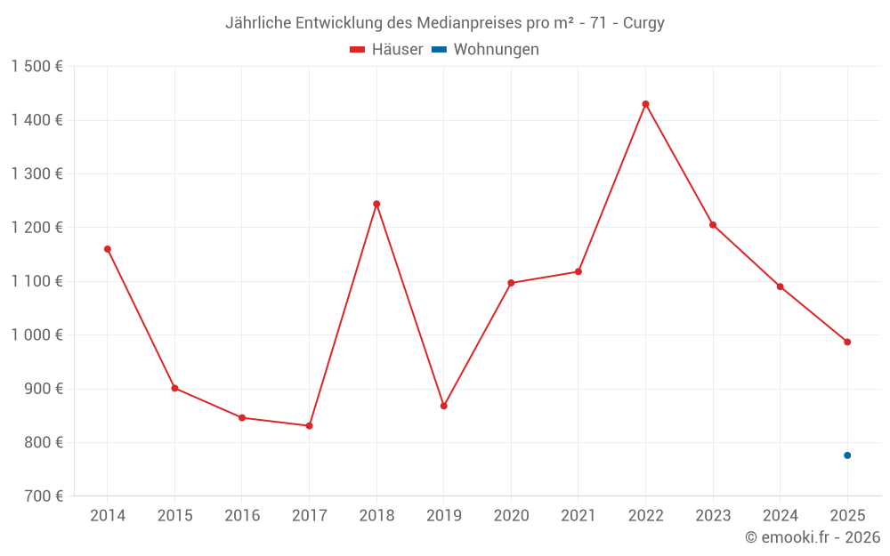 Der Durchschnittspreis auf den 19 Hausgeschäften der letzten 24 Monate in der Gemeinde Curgy betrug 1 144 € pro Quadratmeter für einen mittleren Immobilienwert von 117 820 €. Über diesen Zeitraum hinweg lagen 60% der Transaktionen zwischen 735 und 1 605 € pro Quadratmeter (vom 2. bis zum 8. Dezil).