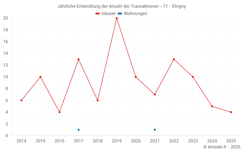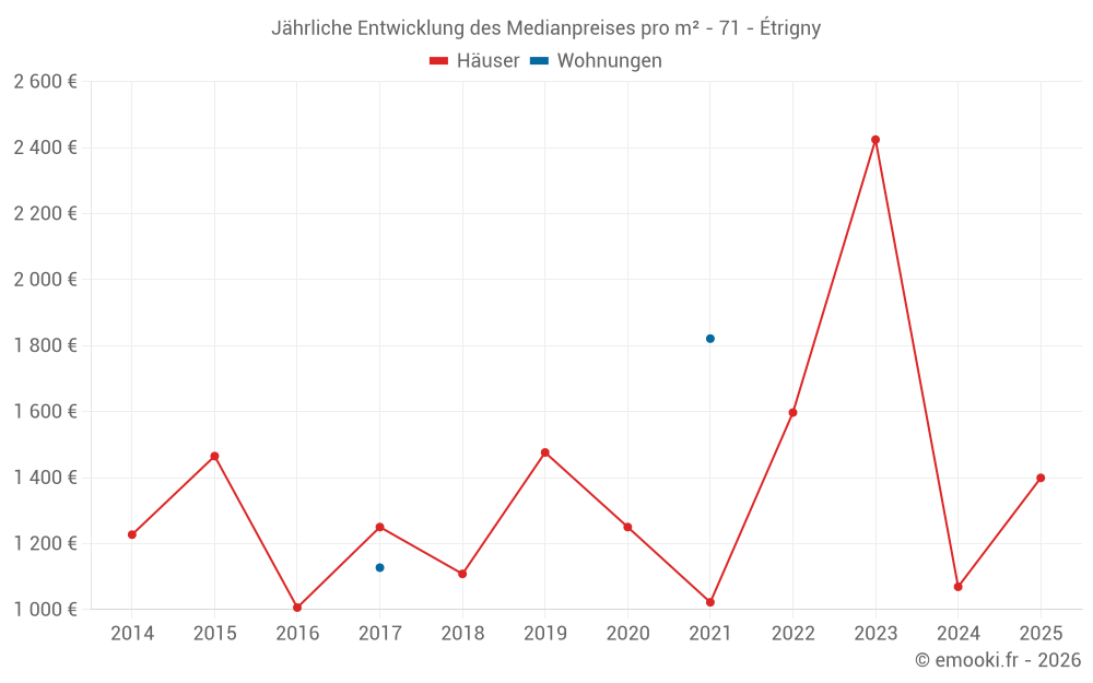 Der Durchschnittspreis auf den 18 Hausgeschäften der letzten 24 Monate in der Gemeinde Étrigny betrug 1 839 € pro Quadratmeter für einen mittleren Immobilienwert von 153 400 €. Über diesen Zeitraum hinweg lagen 60% der Transaktionen zwischen 1 014 und 2 599 € pro Quadratmeter (vom 2. bis zum 8. Dezil).