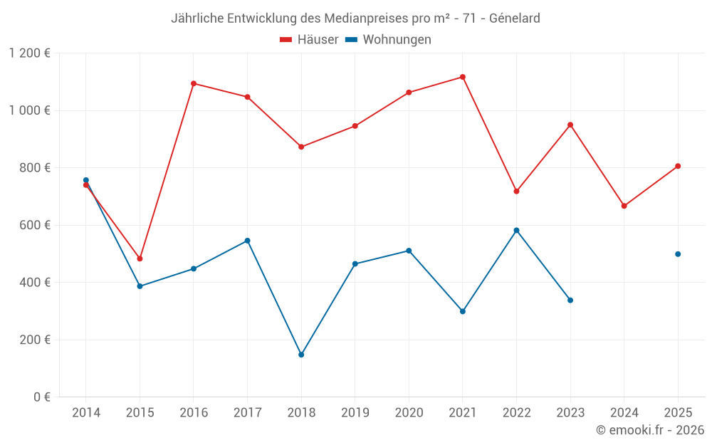 Der Durchschnittspreis auf den 27 Hausgeschäften der letzten 24 Monate in der Gemeinde Génelard betrug 779 € pro Quadratmeter für einen mittleren Immobilienwert von 68 000 €. Über diesen Zeitraum hinweg lagen 60% der Transaktionen zwischen 482 und 1 280 € pro Quadratmeter (vom 2. bis zum 8. Dezil).