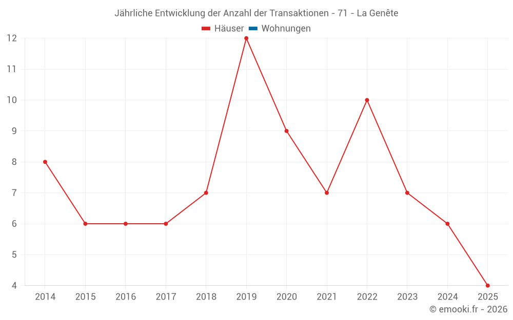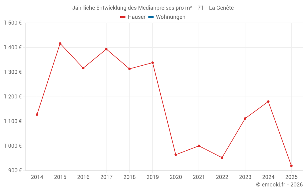 Der Durchschnittspreis auf den 15 Hausgeschäften der letzten 24 Monate in der Gemeinde La Genête betrug 1 171 € pro Quadratmeter für einen mittleren Immobilienwert von 125 000 €. Über diesen Zeitraum hinweg lagen 60% der Transaktionen zwischen 928 und 1 749 € pro Quadratmeter (vom 2. bis zum 8. Dezil).
