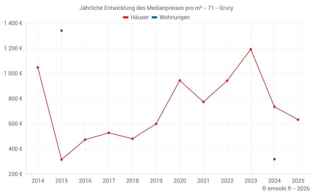 Der Durchschnittspreis auf den 17 Hausgeschäften der letzten 24 Monate in der Gemeinde Grury betrug 750 € pro Quadratmeter für einen mittleren Immobilienwert von 50 000 €. Über diesen Zeitraum hinweg lagen 60% der Transaktionen zwischen 611 und 1 376 € pro Quadratmeter (vom 2. bis zum 8. Dezil).
