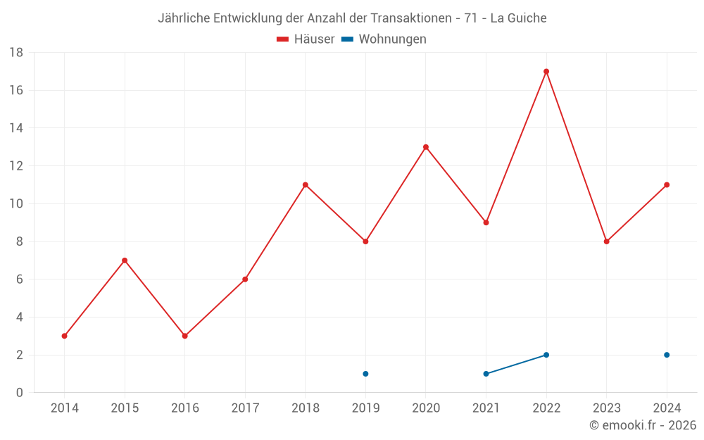 Der Durchschnittspreis auf den 15 Hausgeschäften der letzten 24 Monate in der Gemeinde La Guiche betrug 1 374 € pro Quadratmeter für einen mittleren Immobilienwert von 129 390 €. Über diesen Zeitraum hinweg lagen 60% der Transaktionen zwischen 775 und 2 507 € pro Quadratmeter (vom 2. bis zum 8. Dezil).