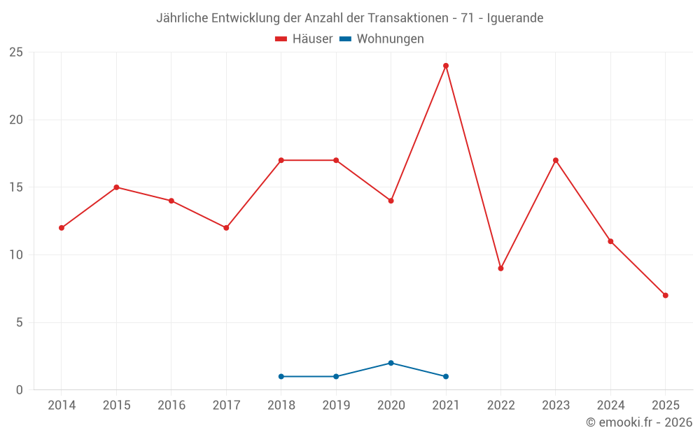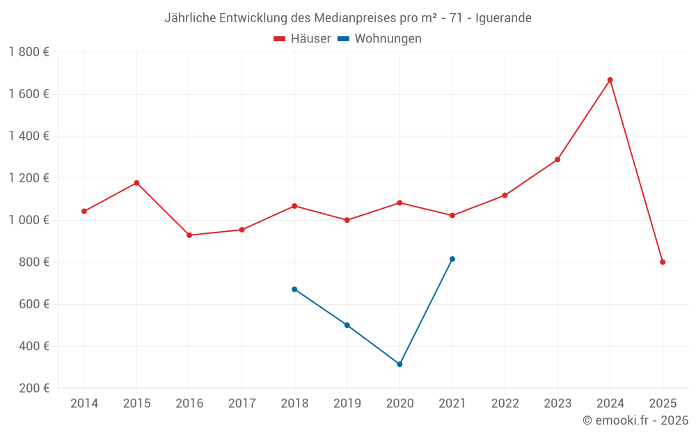 Der Durchschnittspreis auf den 32 Hausgeschäften der letzten 24 Monate in der Gemeinde Iguerande betrug 1 472 € pro Quadratmeter für einen mittleren Immobilienwert von 135 300 €. Über diesen Zeitraum hinweg lagen 60% der Transaktionen zwischen 789 und 1 977 € pro Quadratmeter (vom 2. bis zum 8. Dezil).