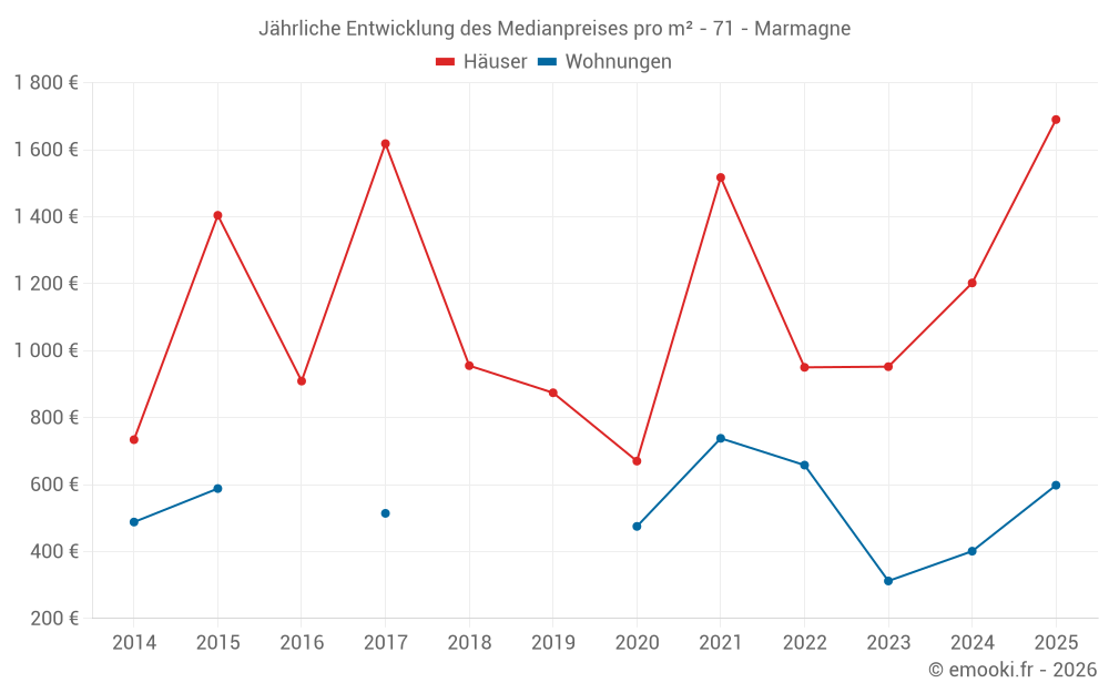 Der Durchschnittspreis auf den 19 Hausgeschäften der letzten 24 Monate in der Gemeinde Marmagne betrug 1 372 € pro Quadratmeter für einen mittleren Immobilienwert von 150 000 €. Über diesen Zeitraum hinweg lagen 60% der Transaktionen zwischen 1 025 und 1 949 € pro Quadratmeter (vom 2. bis zum 8. Dezil).