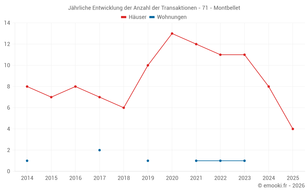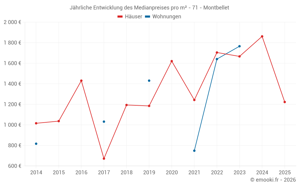 Der Durchschnittspreis auf den 17 Hausgeschäften der letzten 24 Monate in der Gemeinde Montbellet betrug 1 409 € pro Quadratmeter für einen mittleren Immobilienwert von 155 000 €. Über diesen Zeitraum hinweg lagen 60% der Transaktionen zwischen 906 und 2 088 € pro Quadratmeter (vom 2. bis zum 8. Dezil).
