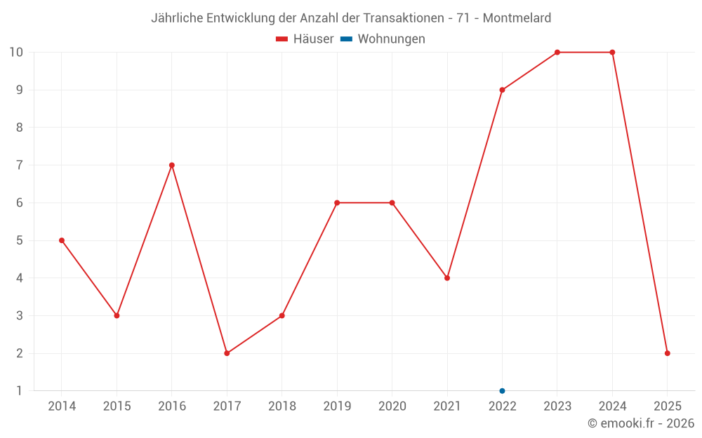 Der Durchschnittspreis auf den 18 Hausgeschäften der letzten 24 Monate in der Gemeinde Montmelard betrug 1 505 € pro Quadratmeter für einen mittleren Immobilienwert von 124 000 €. Über diesen Zeitraum hinweg lagen 60% der Transaktionen zwischen 1 076 und 2 010 € pro Quadratmeter (vom 2. bis zum 8. Dezil).