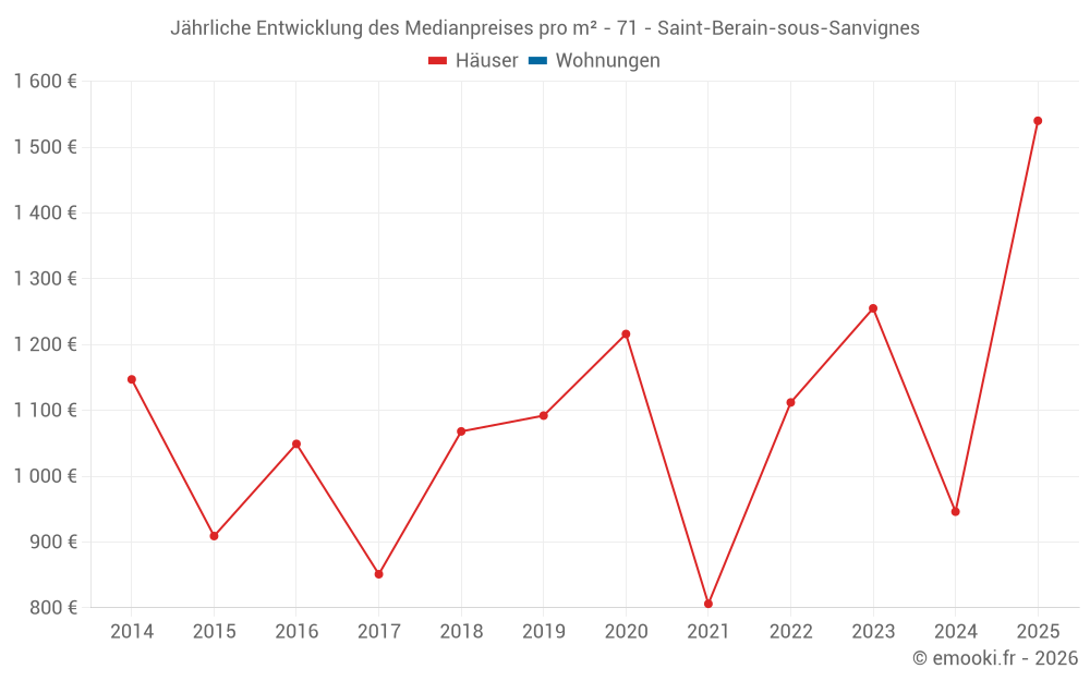 Der Durchschnittspreis auf den 25 Hausgeschäften der letzten 24 Monate in der Gemeinde Saint-Berain-sous-Sanvignes betrug 1 314 € pro Quadratmeter für einen mittleren Immobilienwert von 110 000 €. Über diesen Zeitraum hinweg lagen 60% der Transaktionen zwischen 787 und 1 738 € pro Quadratmeter (vom 2. bis zum 8. Dezil).