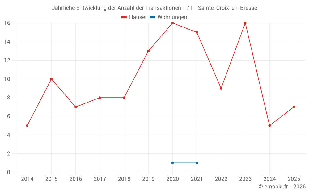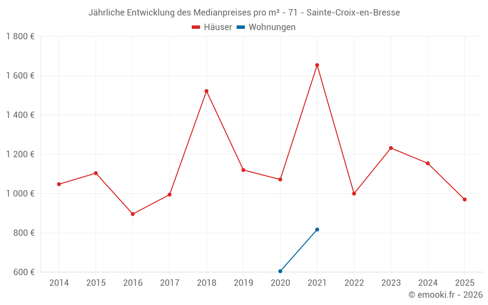 Der Durchschnittspreis auf den 17 Hausgeschäften der letzten 24 Monate in der Gemeinde Sainte-Croix-en-Bresse betrug 1 154 € pro Quadratmeter für einen mittleren Immobilienwert von 130 000 €. Über diesen Zeitraum hinweg lagen 60% der Transaktionen zwischen 859 und 1 604 € pro Quadratmeter (vom 2. bis zum 8. Dezil).