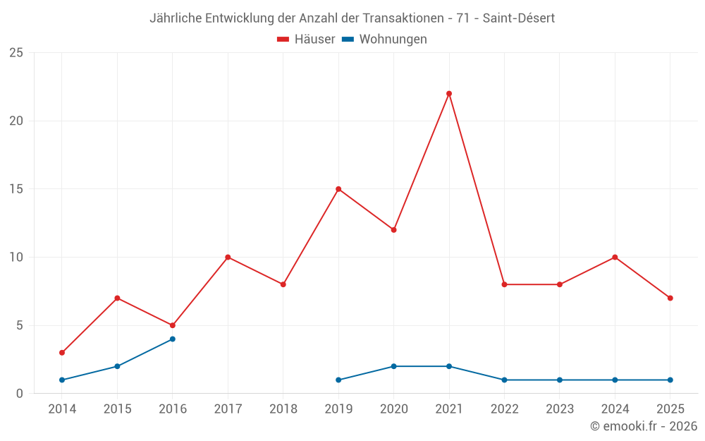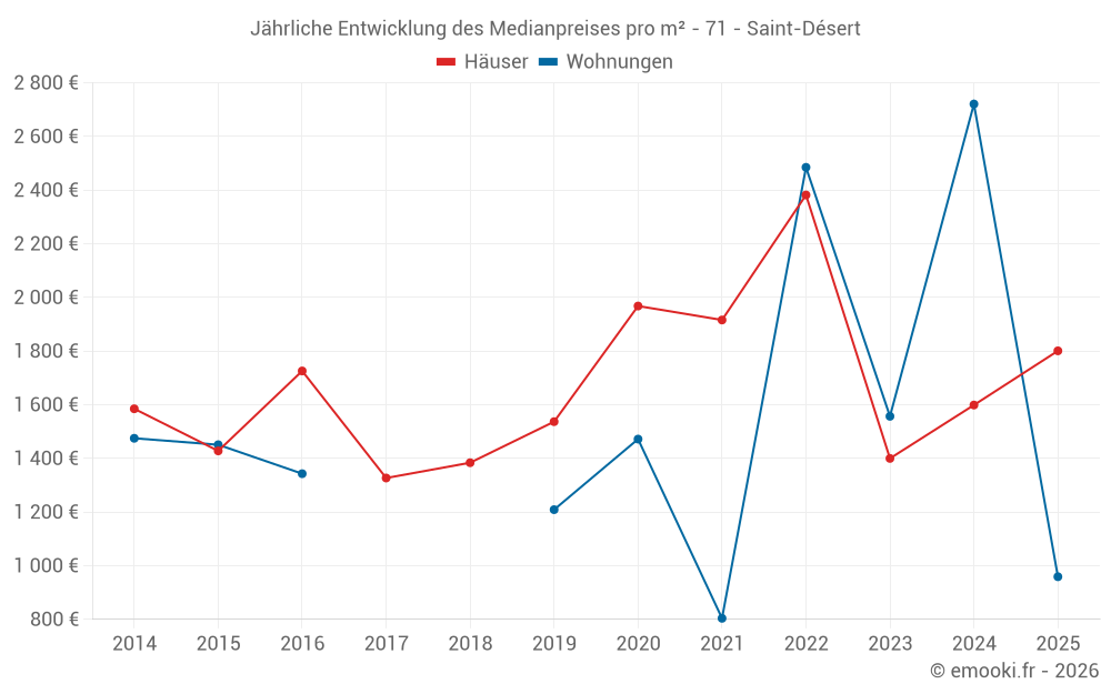 Der Durchschnittspreis auf den 25 Hausgeschäften der letzten 24 Monate in der Gemeinde Saint-Désert betrug 1 583 € pro Quadratmeter für einen mittleren Immobilienwert von 170 000 €. Über diesen Zeitraum hinweg lagen 60% der Transaktionen zwischen 882 und 2 178 € pro Quadratmeter (vom 2. bis zum 8. Dezil).