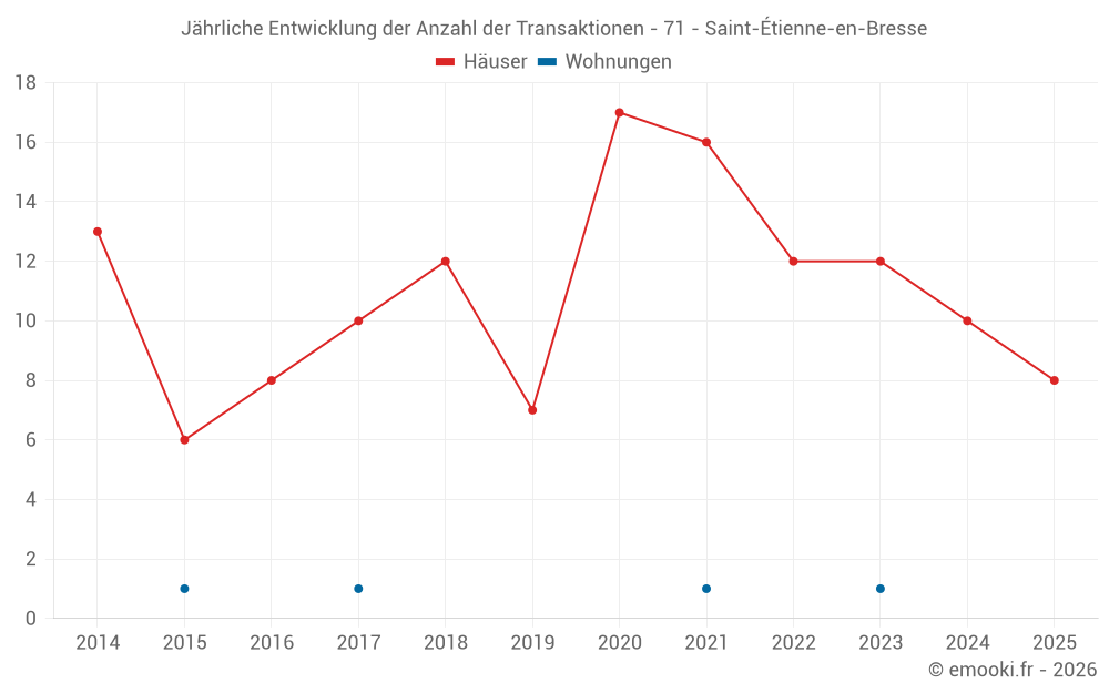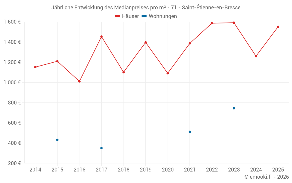 Der Durchschnittspreis auf den 26 Hausgeschäften der letzten 24 Monate in der Gemeinde Saint-Étienne-en-Bresse betrug 1 502 € pro Quadratmeter für einen mittleren Immobilienwert von 137 550 €. Über diesen Zeitraum hinweg lagen 60% der Transaktionen zwischen 1 082 und 1 833 € pro Quadratmeter (vom 2. bis zum 8. Dezil).