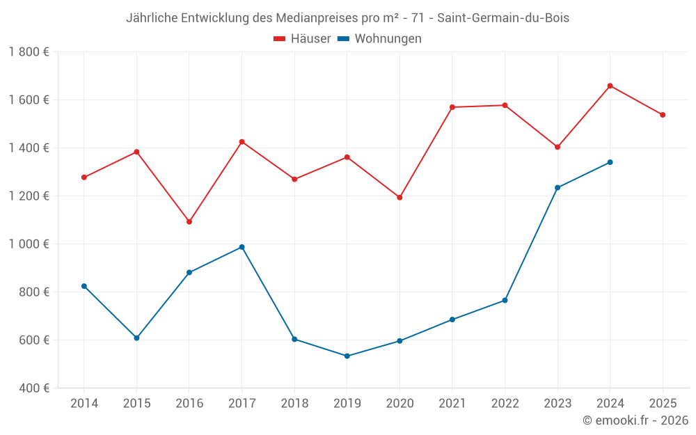 Der Durchschnittspreis auf den 24 Hausgeschäften der letzten 12 Monate in der Gemeinde Saint-Germain-du-Bois betrug 1 725 € pro Quadratmeter für einen mittleren Immobilienwert von 188 500 €. Über diesen Zeitraum hinweg lagen 60% der Transaktionen zwischen 1 374 und 2 106 € pro Quadratmeter (vom 2. bis zum 8. Dezil).