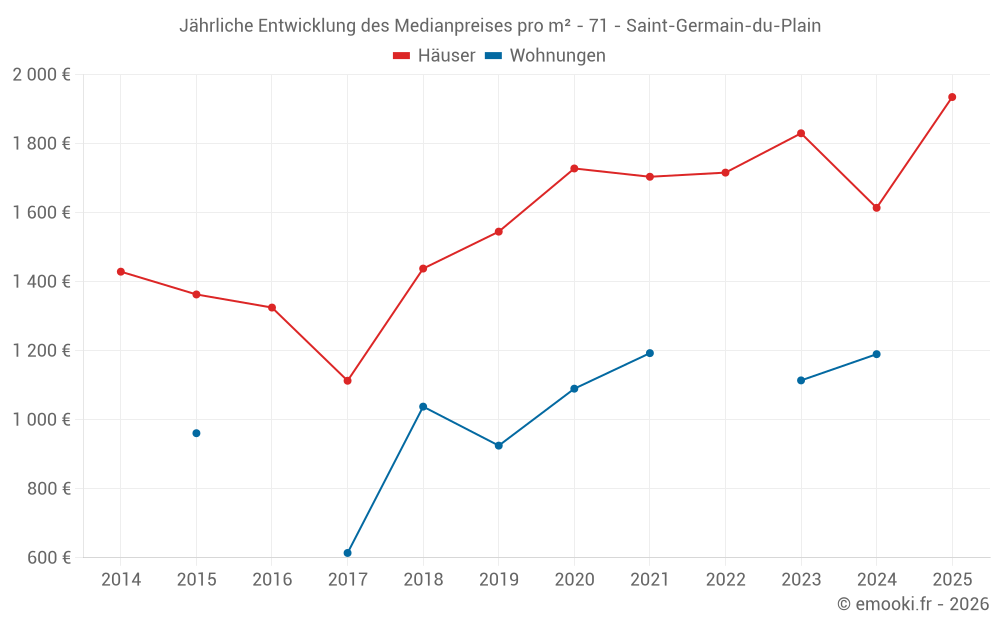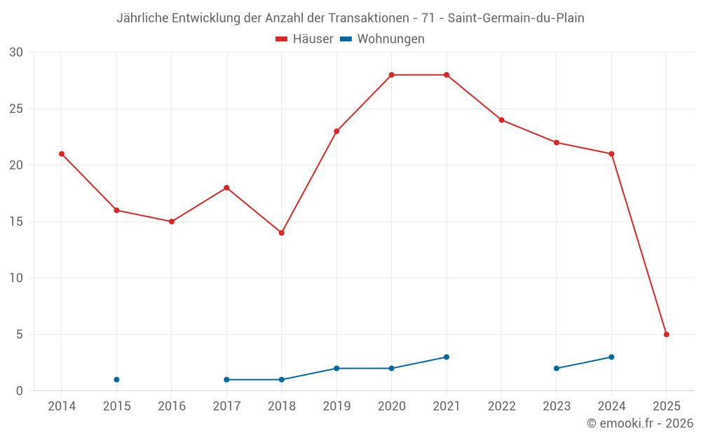 Der Durchschnittspreis auf den 17 Hausgeschäften der letzten 12 Monate in der Gemeinde Saint-Germain-du-Plain betrug 1 614 € pro Quadratmeter für einen mittleren Immobilienwert von 165 000 €. Über diesen Zeitraum hinweg lagen 60% der Transaktionen zwischen 1 254 und 2 254 € pro Quadratmeter (vom 2. bis zum 8. Dezil).