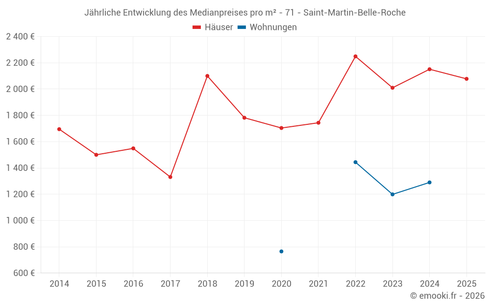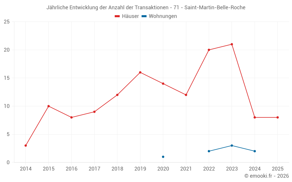 Der Durchschnittspreis auf den 23 Hausgeschäften der letzten 24 Monate in der Gemeinde Saint-Martin-Belle-Roche betrug 2 049 € pro Quadratmeter für einen mittleren Immobilienwert von 195 000 €. Über diesen Zeitraum hinweg lagen 60% der Transaktionen zwischen 1 608 und 2 389 € pro Quadratmeter (vom 2. bis zum 8. Dezil).