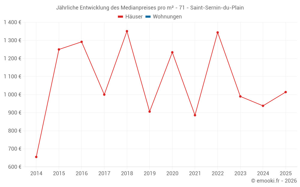 Der Durchschnittspreis auf den 22 Hausgeschäften der letzten 24 Monate in der Gemeinde Saint-Sernin-du-Plain betrug 945 € pro Quadratmeter für einen mittleren Immobilienwert von 92 500 €. Über diesen Zeitraum hinweg lagen 60% der Transaktionen zwischen 559 und 1 744 € pro Quadratmeter (vom 2. bis zum 8. Dezil).