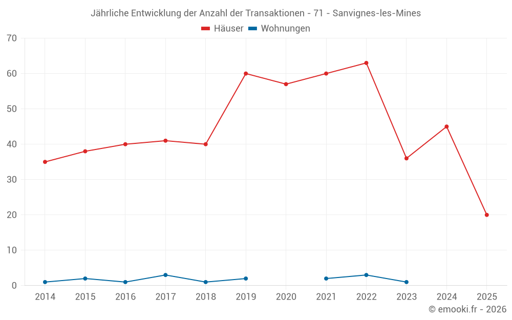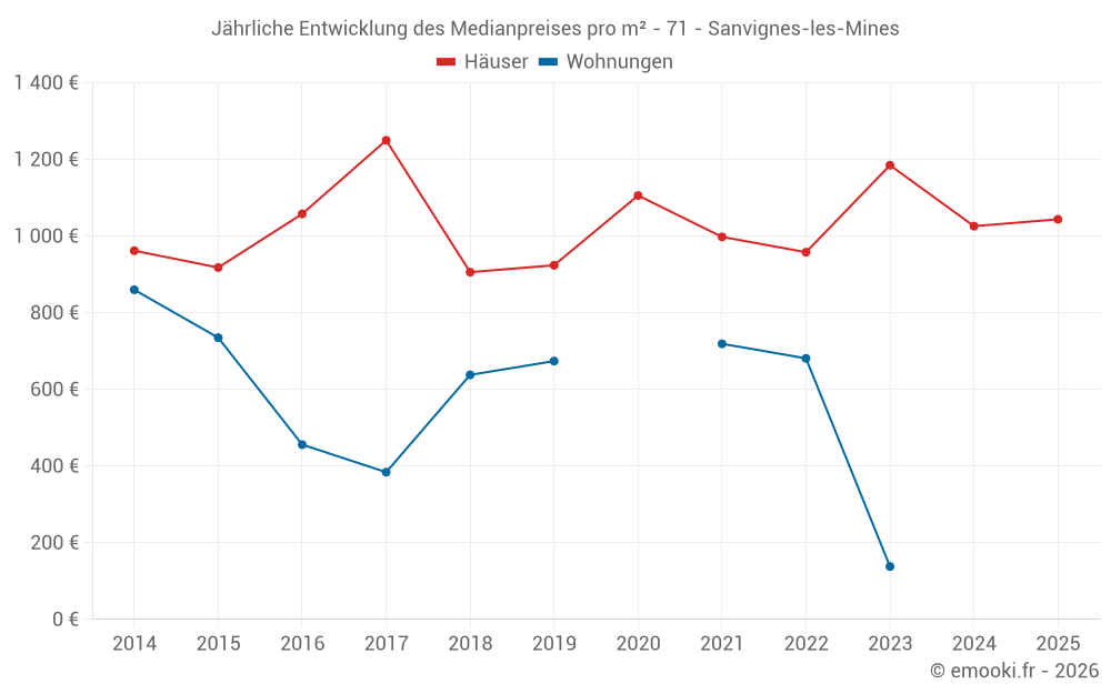 Der Durchschnittspreis auf den 20 Hausgeschäften der letzten 6 Monate in der Gemeinde Sanvignes-les-Mines betrug 1 044 € pro Quadratmeter für einen mittleren Immobilienwert von 82 000 €. Über diesen Zeitraum hinweg lagen 60% der Transaktionen zwischen 588 und 1 407 € pro Quadratmeter (vom 2. bis zum 8. Dezil).
