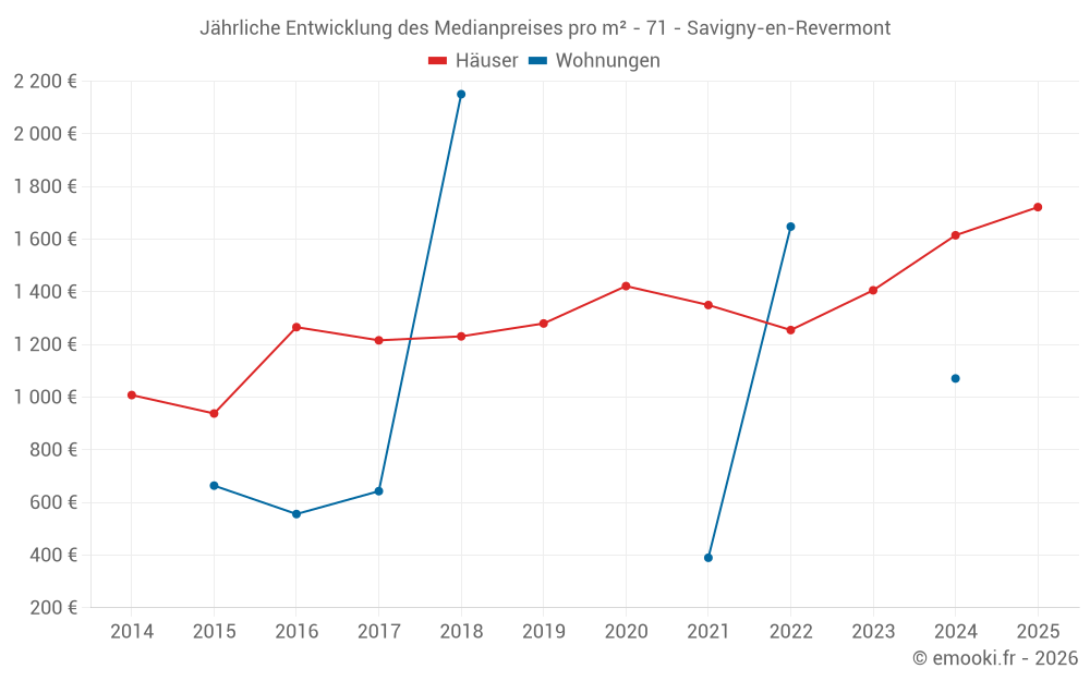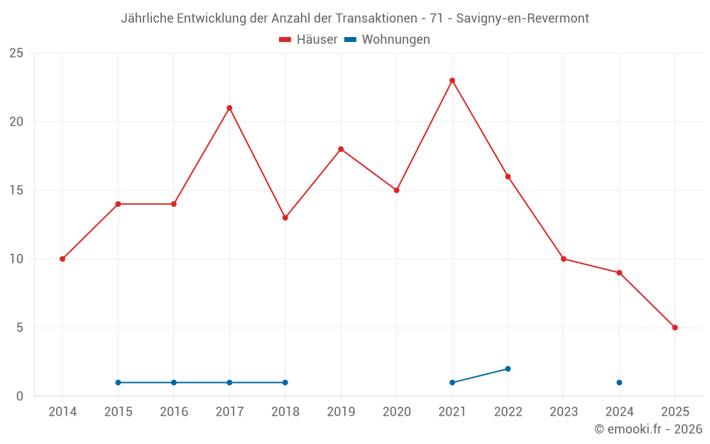 Der Durchschnittspreis auf den 17 Hausgeschäften der letzten 24 Monate in der Gemeinde Savigny-en-Revermont betrug 1 615 € pro Quadratmeter für einen mittleren Immobilienwert von 171 000 €. Über diesen Zeitraum hinweg lagen 60% der Transaktionen zwischen 1 329 und 2 005 € pro Quadratmeter (vom 2. bis zum 8. Dezil).