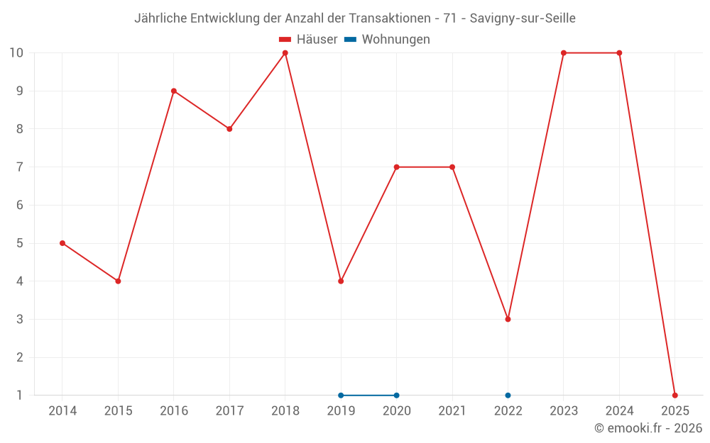 Der Durchschnittspreis auf den 18 Hausgeschäften der letzten 24 Monate in der Gemeinde Savigny-sur-Seille betrug 1 641 € pro Quadratmeter für einen mittleren Immobilienwert von 149 500 €. Über diesen Zeitraum hinweg lagen 60% der Transaktionen zwischen 1 309 und 2 050 € pro Quadratmeter (vom 2. bis zum 8. Dezil).