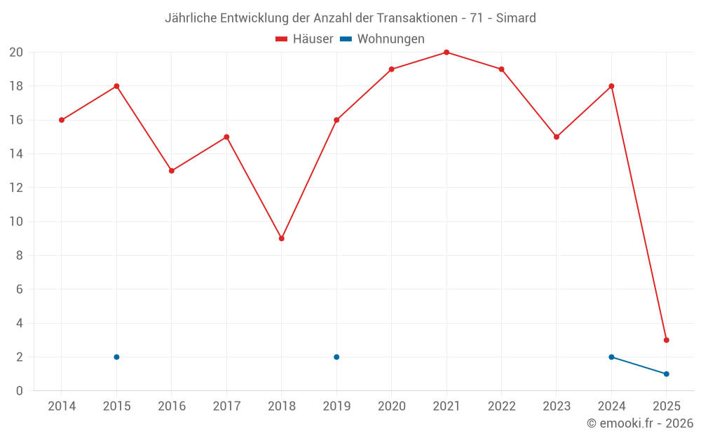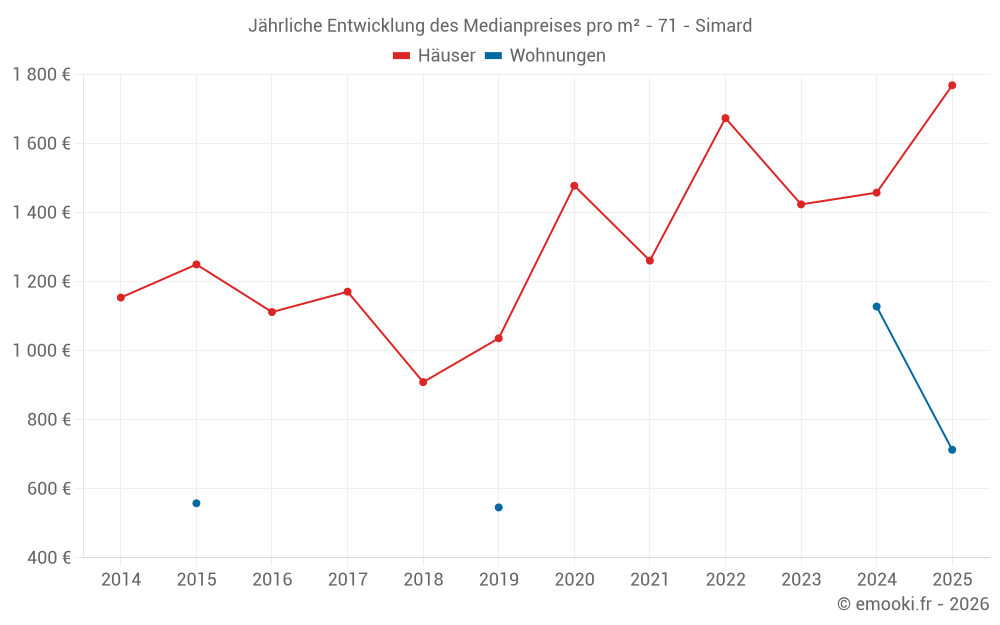 Der Durchschnittspreis auf den 17 Hausgeschäften der letzten 12 Monate in der Gemeinde Simard betrug 1 473 € pro Quadratmeter für einen mittleren Immobilienwert von 147 100 €. Über diesen Zeitraum hinweg lagen 60% der Transaktionen zwischen 1 219 und 2 072 € pro Quadratmeter (vom 2. bis zum 8. Dezil).