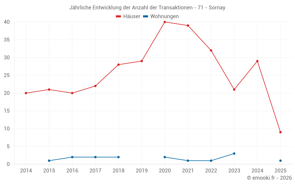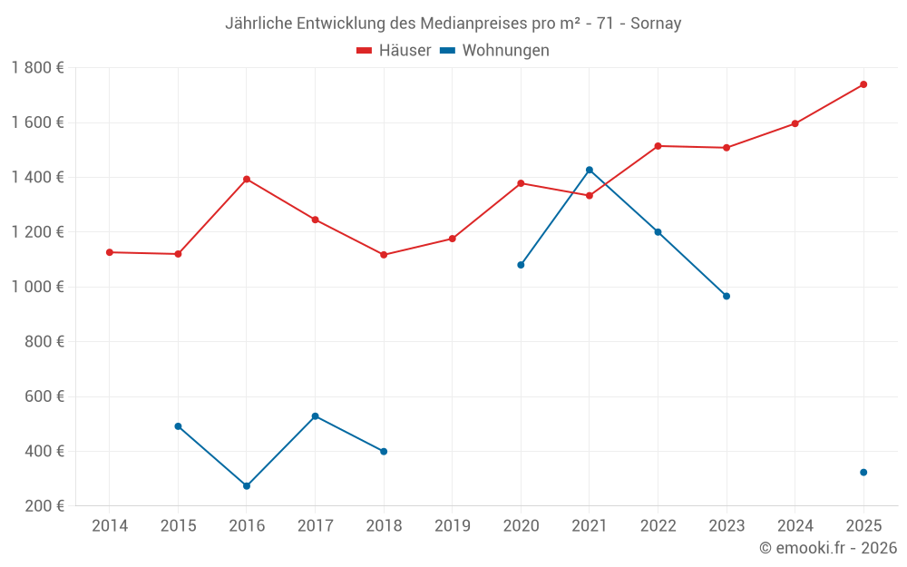 Der Durchschnittspreis auf den 25 Hausgeschäften der letzten 12 Monate in der Gemeinde Sornay betrug 1 739 € pro Quadratmeter für einen mittleren Immobilienwert von 145 000 €. Über diesen Zeitraum hinweg lagen 60% der Transaktionen zwischen 1 022 und 2 122 € pro Quadratmeter (vom 2. bis zum 8. Dezil).