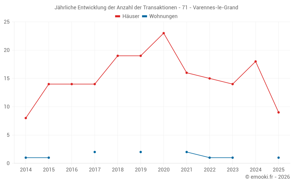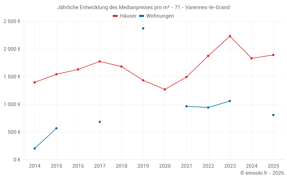 Der Durchschnittspreis auf den 20 Hausgeschäften der letzten 12 Monate in der Gemeinde Varennes-le-Grand betrug 1 824 € pro Quadratmeter für einen mittleren Immobilienwert von 171 205 €. Über diesen Zeitraum hinweg lagen 60% der Transaktionen zwischen 1 110 und 2 123 € pro Quadratmeter (vom 2. bis zum 8. Dezil).