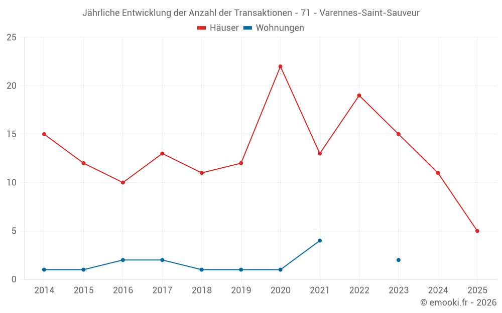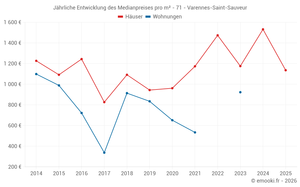 Der Durchschnittspreis auf den 24 Hausgeschäften der letzten 24 Monate in der Gemeinde Varennes-Saint-Sauveur betrug 1 270 € pro Quadratmeter für einen mittleren Immobilienwert von 139 500 €. Über diesen Zeitraum hinweg lagen 60% der Transaktionen zwischen 916 und 1 781 € pro Quadratmeter (vom 2. bis zum 8. Dezil).