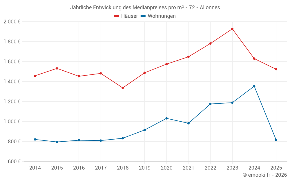 Der Durchschnittspreis auf den 22 Hausgeschäften der letzten 6 Monate in der Gemeinde Allonnes betrug 1 523 € pro Quadratmeter für einen mittleren Immobilienwert von 150 000 €. Über diesen Zeitraum hinweg lagen 60% der Transaktionen zwischen 1 289 und 1 776 € pro Quadratmeter (vom 2. bis zum 8. Dezil).