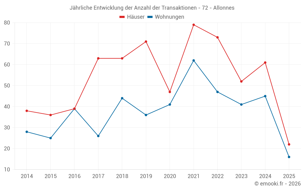 Der Durchschnittspreis auf den 43 Wohnungstransaktionen der letzten 12 Monate in der Gemeinde Allonnes betrug 1 042 € pro Quadratmeter für einen mittleren Immobilienwert von 75 000 €. Über diesen Zeitraum hinweg lagen 60% der Transaktionen zwischen 539 und 1 528 € pro Quadratmeter (vom 2. bis zum 8. Dezil).