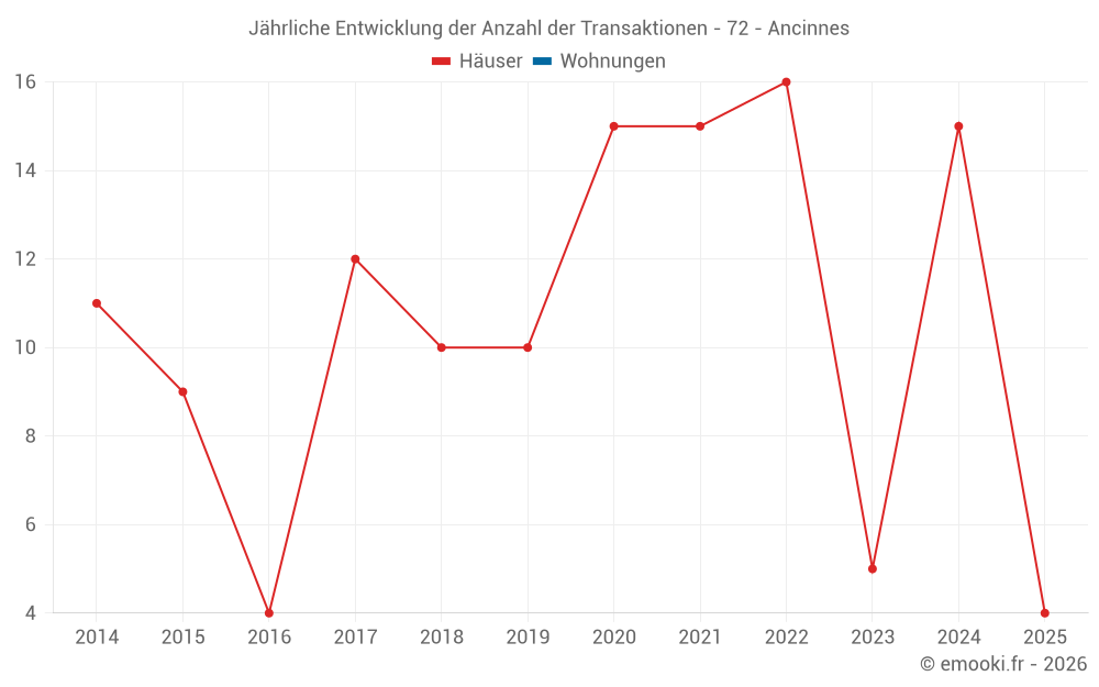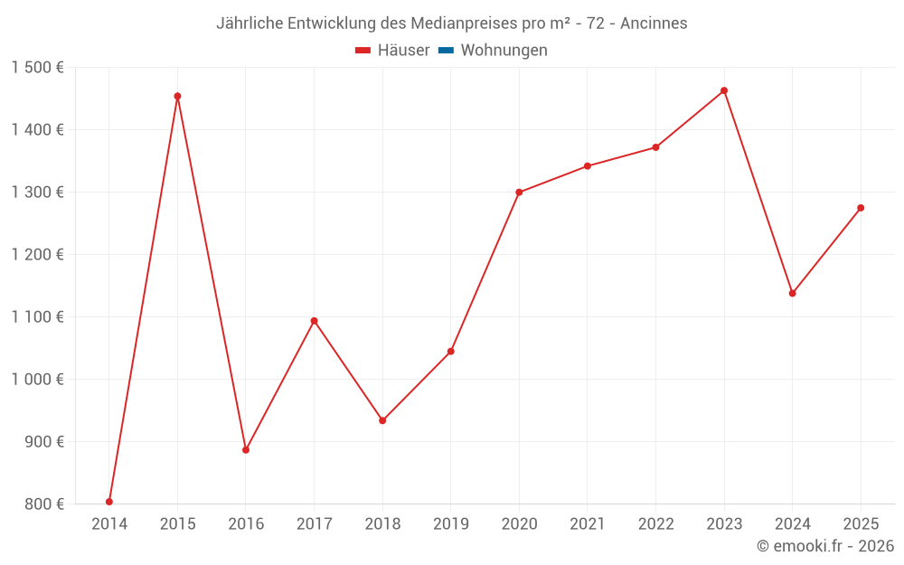 Der Durchschnittspreis auf den 22 Hausgeschäften der letzten 24 Monate in der Gemeinde Ancinnes betrug 1 224 € pro Quadratmeter für einen mittleren Immobilienwert von 141 325 €. Über diesen Zeitraum hinweg lagen 60% der Transaktionen zwischen 892 und 1 809 € pro Quadratmeter (vom 2. bis zum 8. Dezil).
