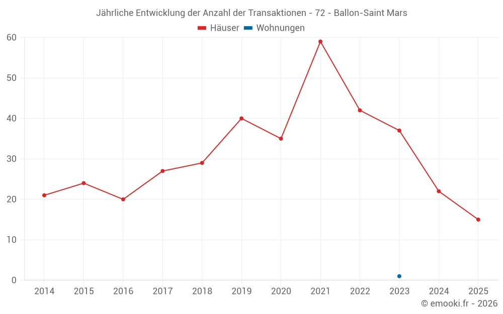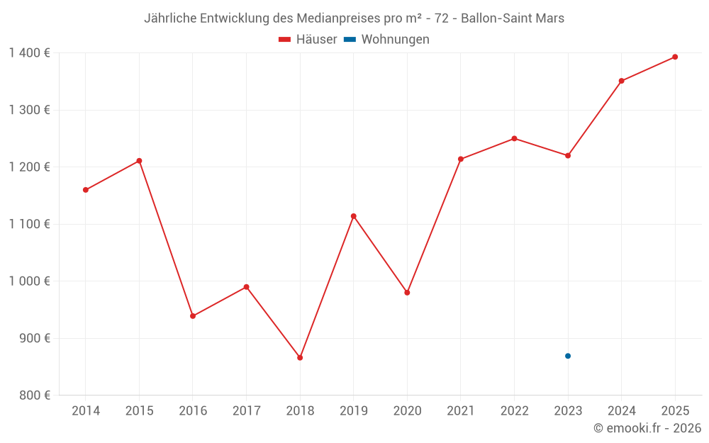 Der Durchschnittspreis auf den 27 Hausgeschäften der letzten 12 Monate in der Gemeinde Ballon-Saint Mars betrug 1 187 € pro Quadratmeter für einen mittleren Immobilienwert von 100 000 €. Über diesen Zeitraum hinweg lagen 60% der Transaktionen zwischen 746 und 1 570 € pro Quadratmeter (vom 2. bis zum 8. Dezil).