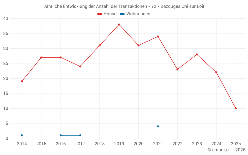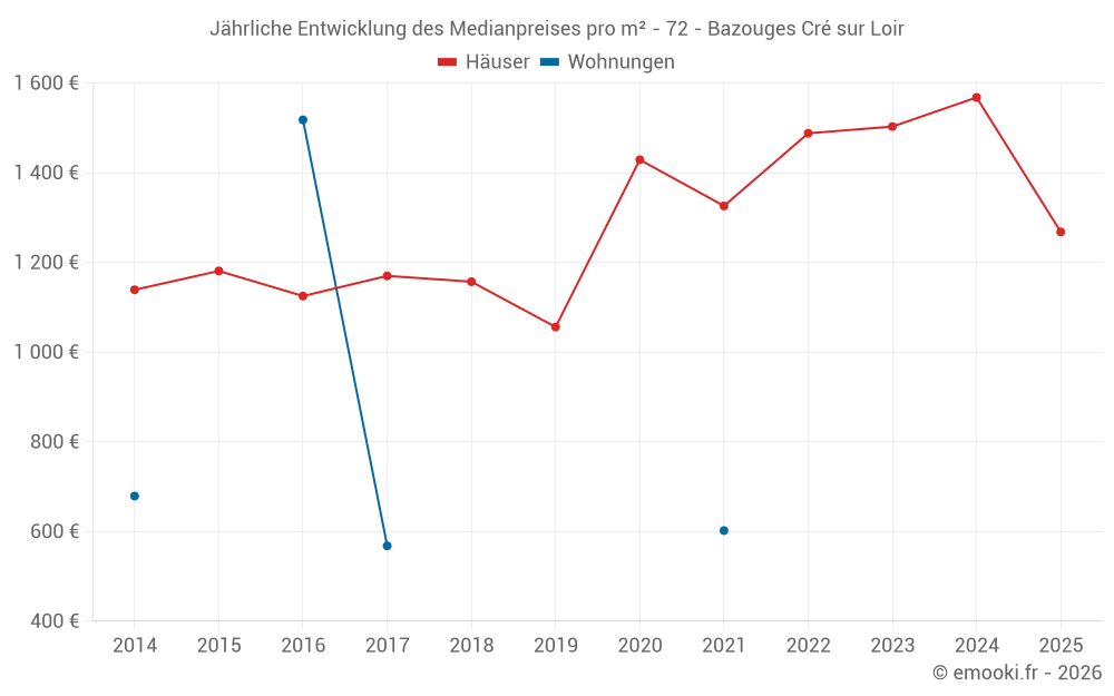 Der Durchschnittspreis auf den 22 Hausgeschäften der letzten 12 Monate in der Gemeinde Bazouges Cré sur Loir betrug 1 529 € pro Quadratmeter für einen mittleren Immobilienwert von 155 000 €. Über diesen Zeitraum hinweg lagen 60% der Transaktionen zwischen 971 und 1 925 € pro Quadratmeter (vom 2. bis zum 8. Dezil).