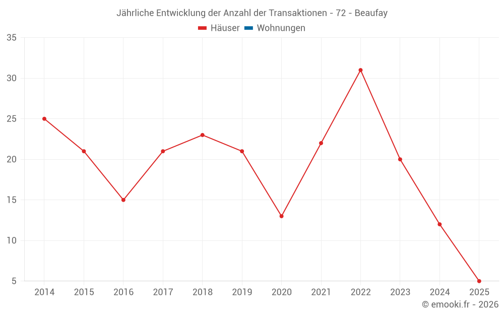 Der Durchschnittspreis auf den 27 Hausgeschäften der letzten 24 Monate in der Gemeinde Beaufay betrug 1 684 € pro Quadratmeter für einen mittleren Immobilienwert von 135 000 €. Über diesen Zeitraum hinweg lagen 60% der Transaktionen zwischen 1 290 und 2 147 € pro Quadratmeter (vom 2. bis zum 8. Dezil).