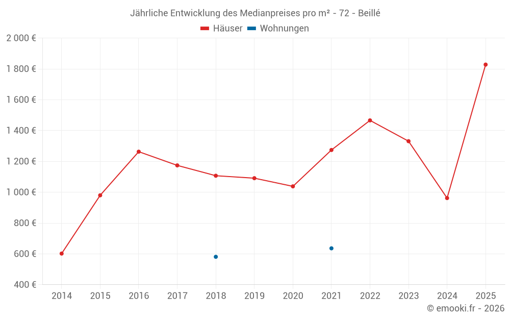 Der Durchschnittspreis auf den 17 Hausgeschäften der letzten 24 Monate in der Gemeinde Beillé betrug 1 378 € pro Quadratmeter für einen mittleren Immobilienwert von 105 000 €. Über diesen Zeitraum hinweg lagen 60% der Transaktionen zwischen 832 und 1 634 € pro Quadratmeter (vom 2. bis zum 8. Dezil).