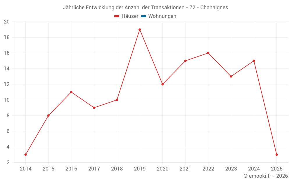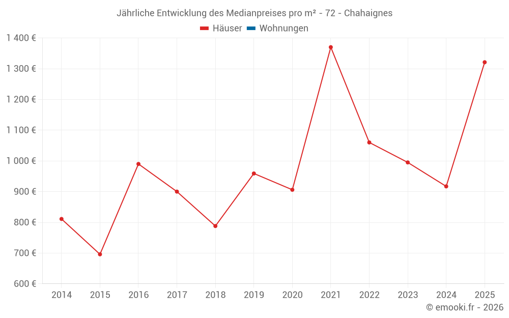 Der Durchschnittspreis auf den 23 Hausgeschäften der letzten 24 Monate in der Gemeinde Chahaignes betrug 1 011 € pro Quadratmeter für einen mittleren Immobilienwert von 85 000 €. Über diesen Zeitraum hinweg lagen 60% der Transaktionen zwischen 805 und 1 532 € pro Quadratmeter (vom 2. bis zum 8. Dezil).