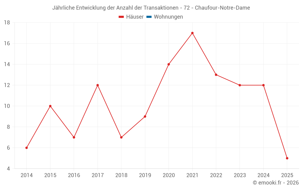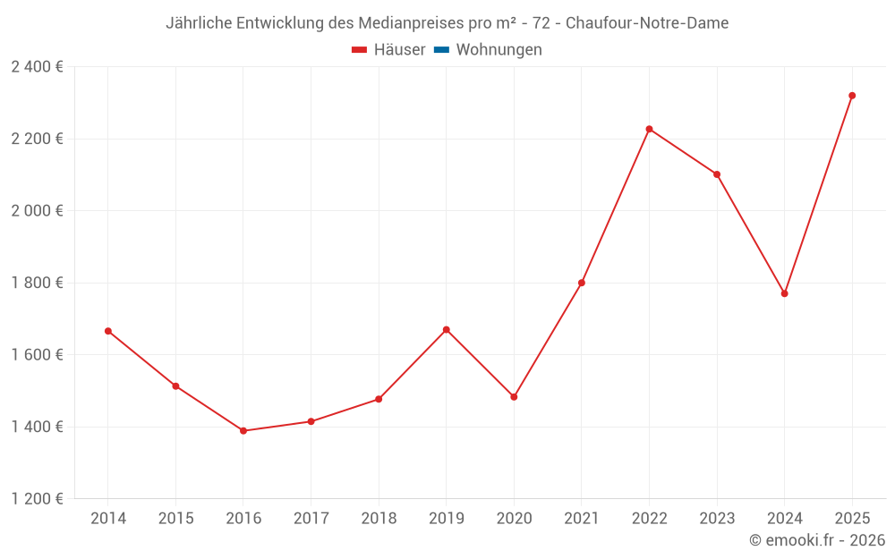 Der Durchschnittspreis auf den 18 Hausgeschäften der letzten 24 Monate in der Gemeinde Chaufour-Notre-Dame betrug 1 866 € pro Quadratmeter für einen mittleren Immobilienwert von 178 625 €. Über diesen Zeitraum hinweg lagen 60% der Transaktionen zwischen 1 426 und 2 242 € pro Quadratmeter (vom 2. bis zum 8. Dezil).