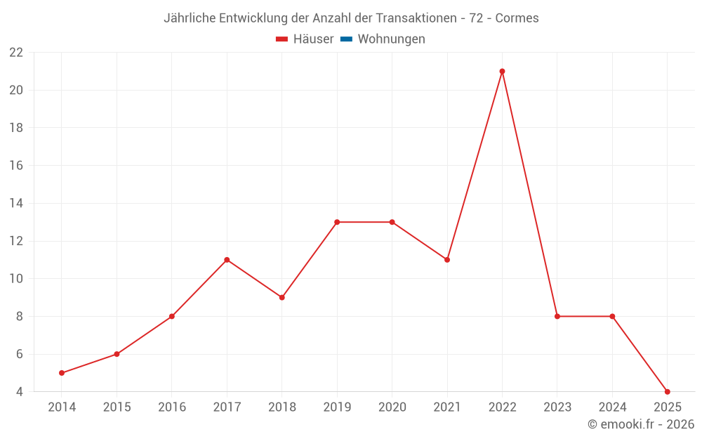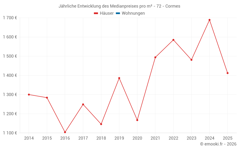 Der Durchschnittspreis auf den 18 Hausgeschäften der letzten 24 Monate in der Gemeinde Cormes betrug 1 616 € pro Quadratmeter für einen mittleren Immobilienwert von 171 575 €. Über diesen Zeitraum hinweg lagen 60% der Transaktionen zwischen 1 426 und 2 077 € pro Quadratmeter (vom 2. bis zum 8. Dezil).
