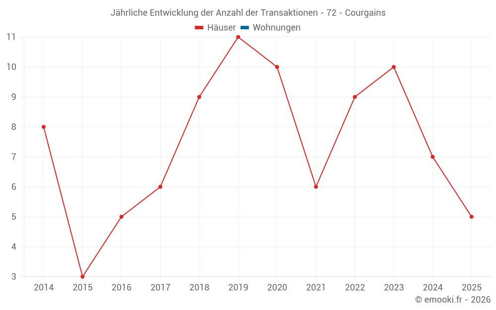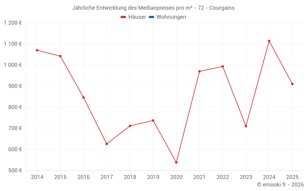 Der Durchschnittspreis auf den 16 Hausgeschäften der letzten 24 Monate in der Gemeinde Courgains betrug 1 013 € pro Quadratmeter für einen mittleren Immobilienwert von 98 250 €. Über diesen Zeitraum hinweg lagen 60% der Transaktionen zwischen 567 und 1 220 € pro Quadratmeter (vom 2. bis zum 8. Dezil).