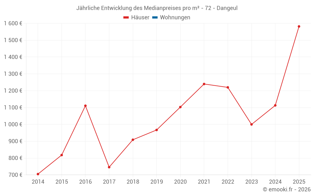 Der Durchschnittspreis auf den 15 Hausgeschäften der letzten 24 Monate in der Gemeinde Dangeul betrug 1 113 € pro Quadratmeter für einen mittleren Immobilienwert von 87 000 €. Über diesen Zeitraum hinweg lagen 60% der Transaktionen zwischen 788 und 1 695 € pro Quadratmeter (vom 2. bis zum 8. Dezil).