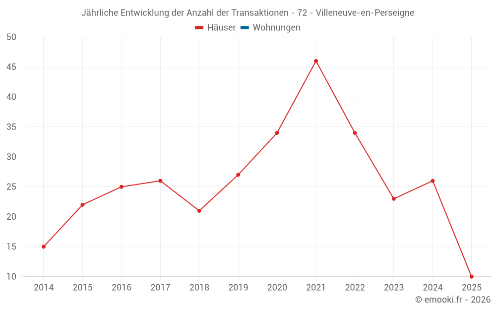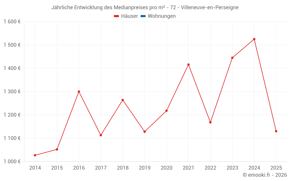 Der Durchschnittspreis auf den 26 Hausgeschäften der letzten 12 Monate in der Gemeinde Villeneuve-en-Perseigne betrug 1 503 € pro Quadratmeter für einen mittleren Immobilienwert von 149 500 €. Über diesen Zeitraum hinweg lagen 60% der Transaktionen zwischen 769 und 2 169 € pro Quadratmeter (vom 2. bis zum 8. Dezil).