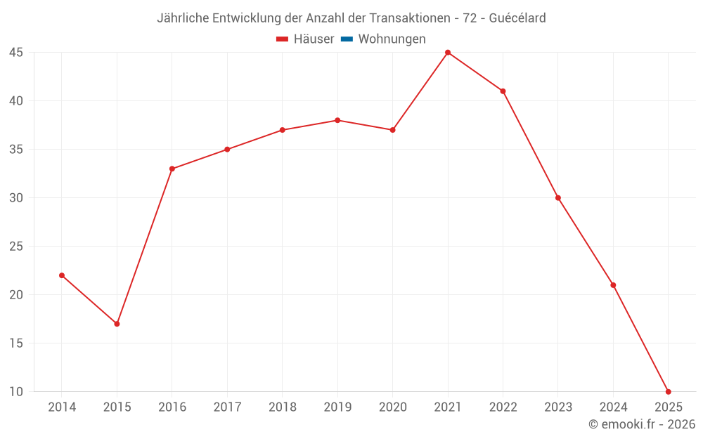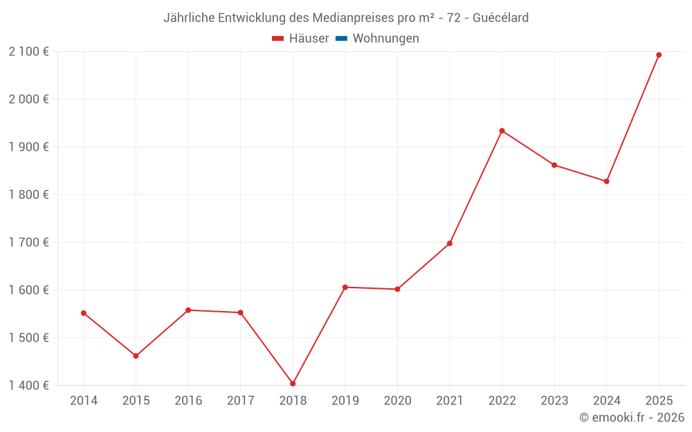 Der Durchschnittspreis auf den 25 Hausgeschäften der letzten 12 Monate in der Gemeinde Guécélard betrug 2 012 € pro Quadratmeter für einen mittleren Immobilienwert von 190 580 €. Über diesen Zeitraum hinweg lagen 60% der Transaktionen zwischen 1 667 und 2 228 € pro Quadratmeter (vom 2. bis zum 8. Dezil).