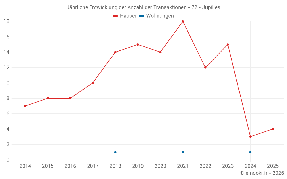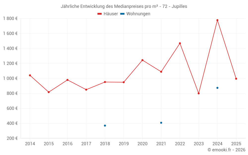 Der Durchschnittspreis auf den 15 Hausgeschäften der letzten 24 Monate in der Gemeinde Jupilles betrug 1 102 € pro Quadratmeter für einen mittleren Immobilienwert von 90 000 €. Über diesen Zeitraum hinweg lagen 60% der Transaktionen zwischen 587 und 1 899 € pro Quadratmeter (vom 2. bis zum 8. Dezil).
