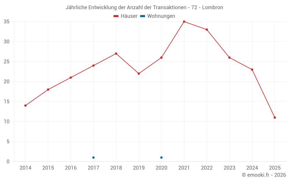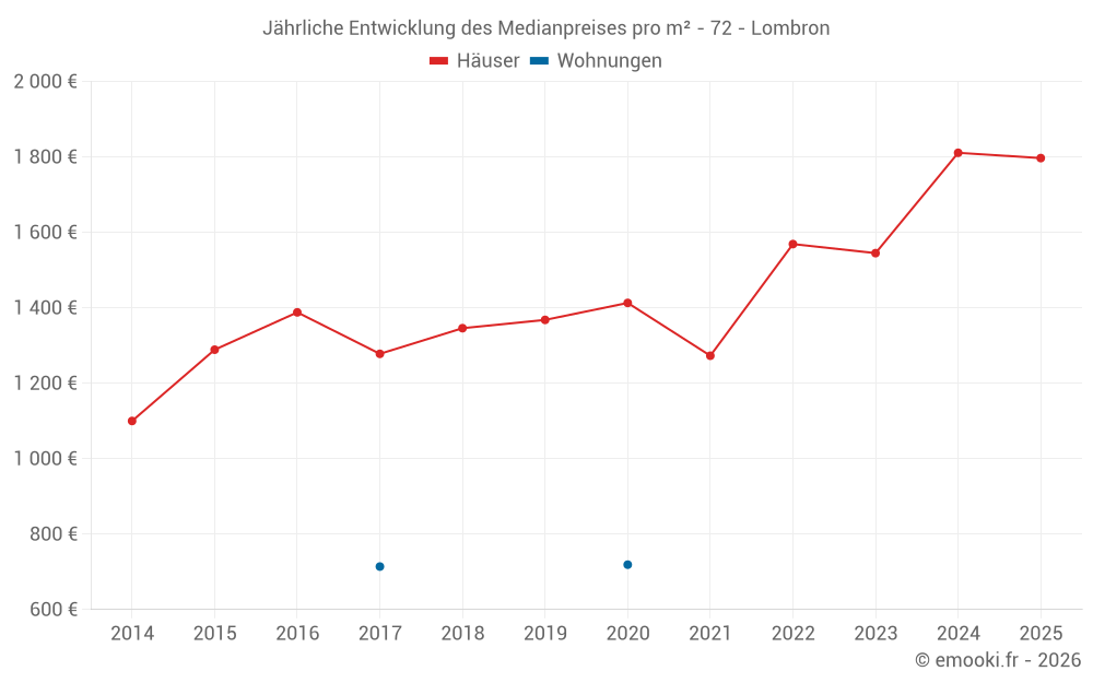 Der Durchschnittspreis auf den 23 Hausgeschäften der letzten 12 Monate in der Gemeinde Lombron betrug 1 924 € pro Quadratmeter für einen mittleren Immobilienwert von 180 000 €. Über diesen Zeitraum hinweg lagen 60% der Transaktionen zwischen 1 384 und 2 086 € pro Quadratmeter (vom 2. bis zum 8. Dezil).