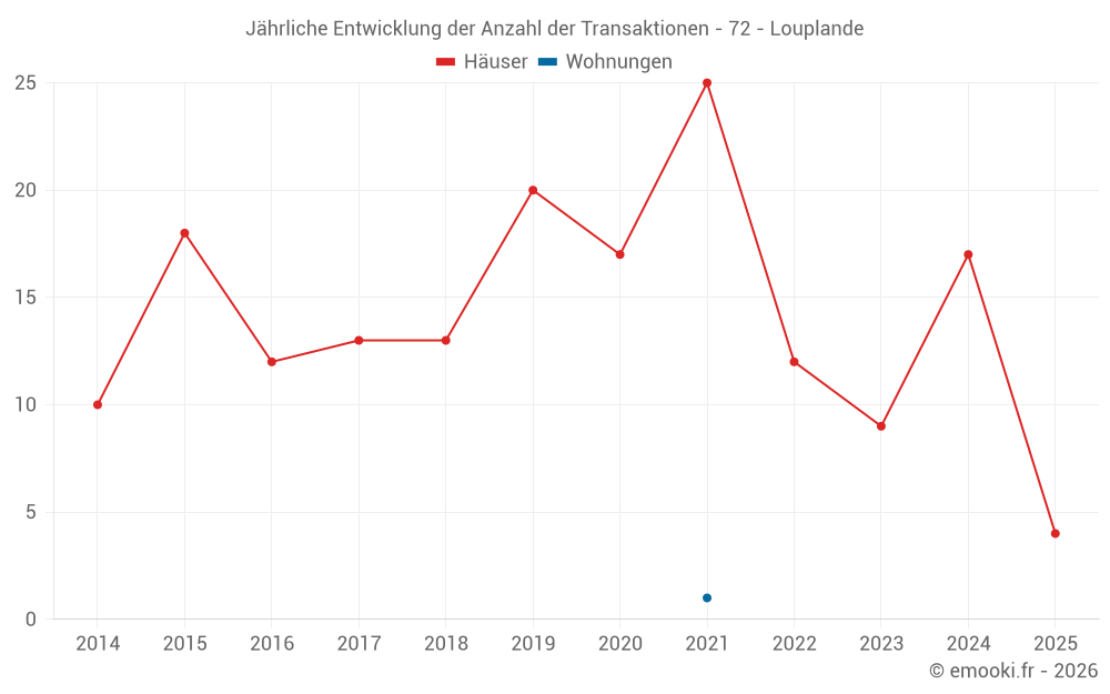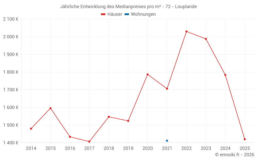 Der Durchschnittspreis auf den 27 Hausgeschäften der letzten 24 Monate in der Gemeinde Louplande betrug 1 784 € pro Quadratmeter für einen mittleren Immobilienwert von 178 500 €. Über diesen Zeitraum hinweg lagen 60% der Transaktionen zwischen 1 205 und 2 203 € pro Quadratmeter (vom 2. bis zum 8. Dezil).