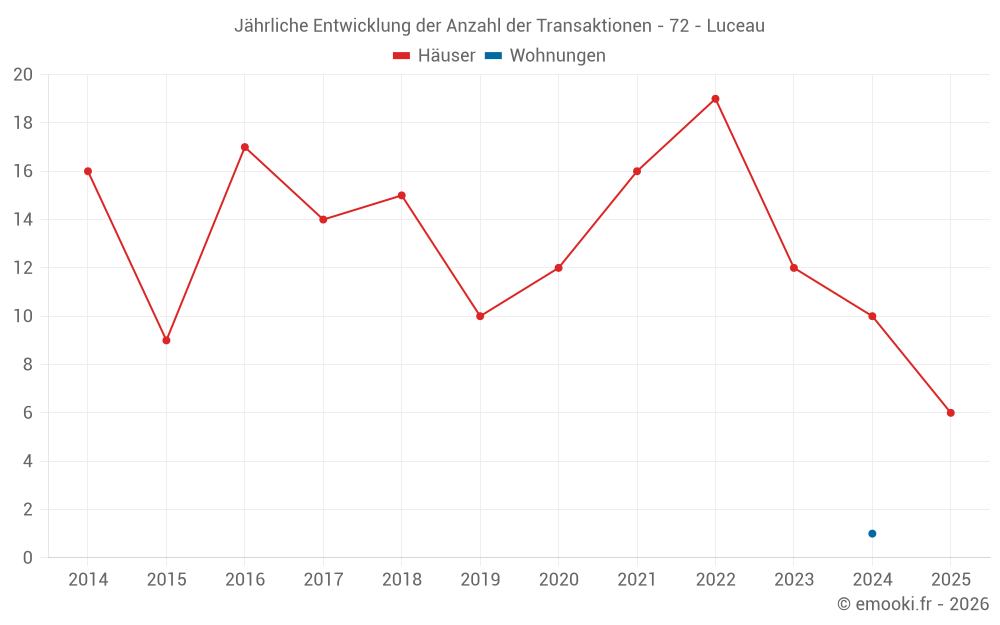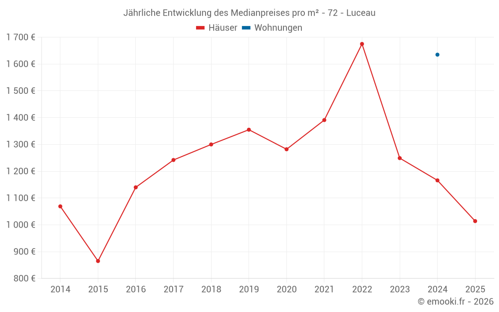 Der Durchschnittspreis auf den 22 Hausgeschäften der letzten 24 Monate in der Gemeinde Luceau betrug 1 069 € pro Quadratmeter für einen mittleren Immobilienwert von 121 400 €. Über diesen Zeitraum hinweg lagen 60% der Transaktionen zwischen 699 und 1 546 € pro Quadratmeter (vom 2. bis zum 8. Dezil).